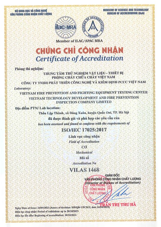 VFPI đã đạt chuẩn ISO/IEC 17025:2017, đáp ứng yêu cầu đối với các đơn vị kiểm định PCCC theo Nghị định 136/2020/NĐ-CP.
